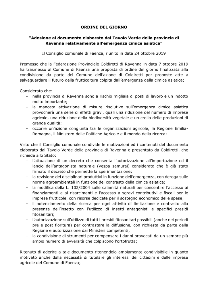 Cimice asiatica: è un’emergenza, siamo già in ritardo, servono interventi forti. In Consiglio un Ordine del Giorno che fa proprie le richieste del tavolo verde della Provincia di Ravenna.