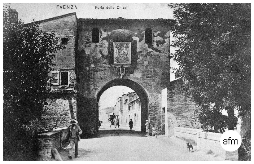Porta Imolese, dietro la merlatura sulla destra si intravede l’ospedale. La porta, minata, fu fatta saltare dai tedeschi in ritirata nel dicembre del 1944, poco prima della liberazione della città. Foto: 1915-1920 donazione G.E. Ghinassi Giuseppe Emiliani