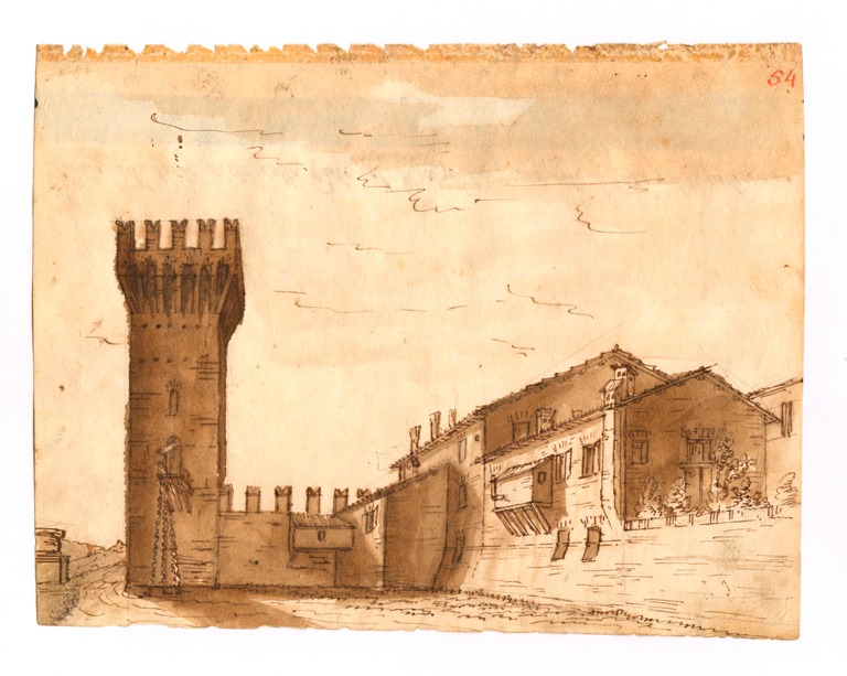 Disegno di Romolo Liverani (sec. XIX) che raffigura Porta Ponte e la torre del Ponte sul lato della città Immagine: IBC Emilia-Romagna, proprietà Biblioteca Comunale Manfrediana Faenza