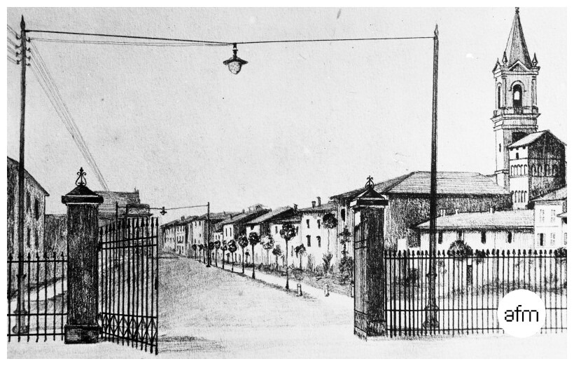 Barriera Firenze con il nuovo viale Baccarini, inaugurata nel 1895 a servizio della nuova stazione. Sulla destra si nota il campanile di San Domenico e la torre del filatoio (tutt’ora esistente) Immagine: 1890, disegno di Vassura Antonio Maria