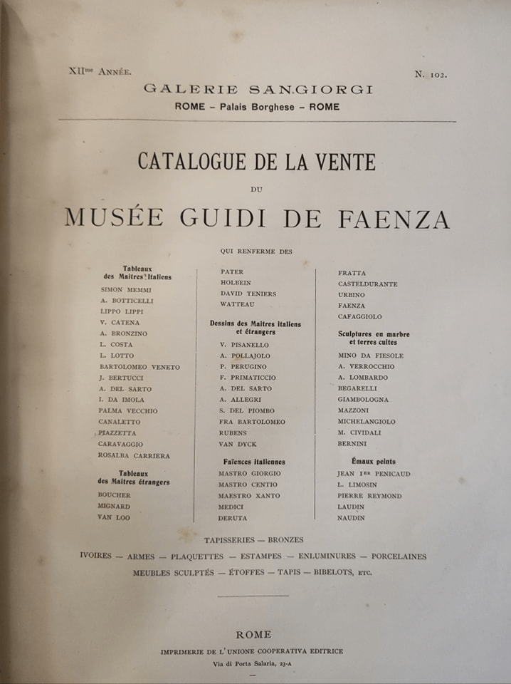 Questo passaggio sul Museo Guidi mi incuriosisce, non ne so nulla e quindi inzio una ricerca per capire se ci sono informazioni sul destino di questi ritrovamenti. Scopro poi che a Roma nel 1902 si tenne un’asta che prevedeva l’incanto di oltre seicento opere e tra queste anche quelle del Museo Guidi di Faenza.