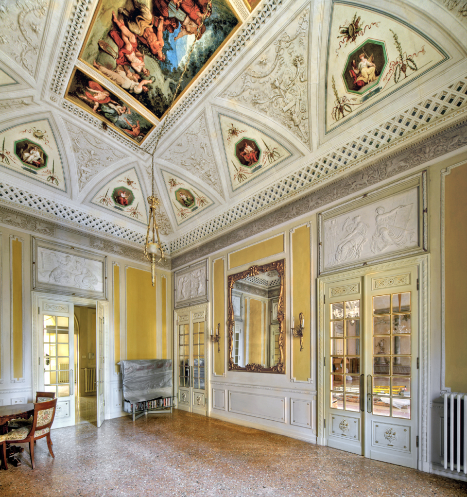 Le decorazioni parietali con finti colonnati, scalinate, vasi e festoni non si discostano molto dalla tradizione, ma basta poco tempo perchè il giovane decoratore prima indicato come “un certo signor Giani di Pavia”, riscuotesse consenso e ammirazione ed entrasse in contatto con le personalità più in vista fra cui i Laderchi. La decorazione delle due sale attigue, che dovrebbe cadere fra il 1795 e il 1802, (in questo periodo l’artista inizia ad annotare con una certa regolarità i suoi impegni di lavoro), mostrano una concezione progettuale dicharatamente neoclassica che tiene conto sia di un complesso lavoro di équipe degli ornatisti a corredo degli scomparti figurati più ridotti, sia degli interventi degli stuccatori Antonio Trentanove e Gian Battista Ballanti Graziani. Equipe che ritroveremo all’opera nella decorazione di Palazzo Milzetti.