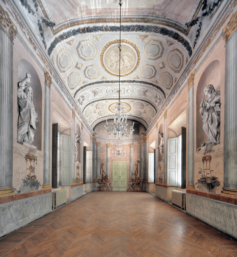 Per la parte figurata racchiusa dell’ottagono centrale della volta raffigurante l’Allegoria della Pace viene convocato un giovane pittore, Felice Giani, che Barozzi aveva probabilmente conosciuto a Bologna durante la sua prima formazione presso l’Accademia Clementina prima del 1780. Sarà sufficiente poco tempo per farsi conoscere ed apprezzare poichè dopo solo due mesi viene indicato dalle cronache locali non più come un certo Giani, ma il bravo sig. Felice Giani. Del resto in quello sfondato vaporoso di gusto ancora settecentesco, già si imponevano l’eleganza disinvolta delle forme armoniosamente disposte ma anche energia, vitalità e quella travolgente carica espressiva che saranno motivo dei successi futuri. Anche I monocromi delle pareti brevi sono di sua mano, ma ridipinti in un successivo restauro, come non è da escludere qualche suo intervento nelle composizioni delle pareti. Le statue delle pareti sono opere di Antonio Trentanove.