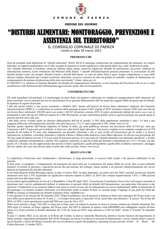 Il 28 marzo il Consiglio Comunale ha approvato all’unanimità l’ordine del giorno volto ad ottenere maggiore attenzione sui disturbi alimentari, sempre più frequenti e per lavorare maggiormente sulla prevenzione e articolare una efficace assistenza nel territorio
