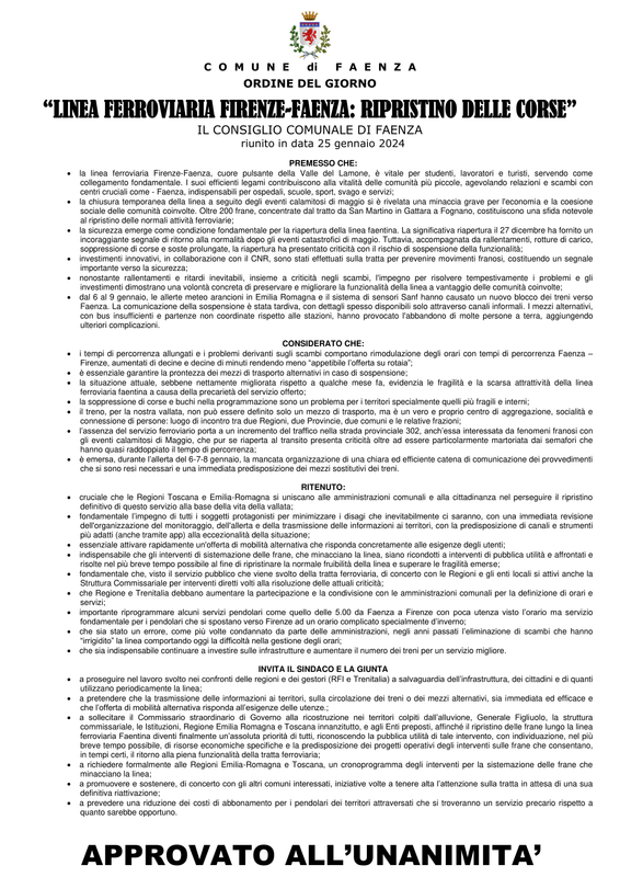 Continua a leggere: Dal Consiglio all’unanimità la richiesta per tempi certi sul ripristino della FaentinaIl Consiglio Comunale nella seduta del 25 gennaio 2024 ha approvato all’unanimità un documento per chiedere che ci sia attenzione sulla Ferrovia Faentina, per arrivare il prima possibile e con tempi certi ad una soluzione delle criticità e per tornare così ad una piena e normale funzionalità.