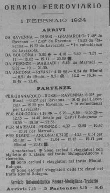 Guardando gli orari dei collegamenti ferroviari possiamo dedurre come il servizio di trasporto bagagli e passeggeri iniziasse la sua attività circa alle 4 del mattino per concludersi oltre la mezzanotte con l’ultimo arrivo del treno da Bologna in direzione Rimini.