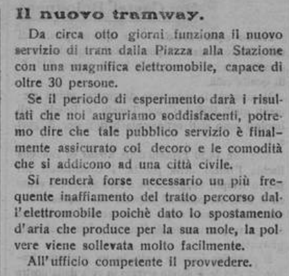 Da circa otto giorni funziona il nuovo servizio di tram dalla Piazza alla Stazione con una magnifica elettromobile, capace di oltre 30 persone.