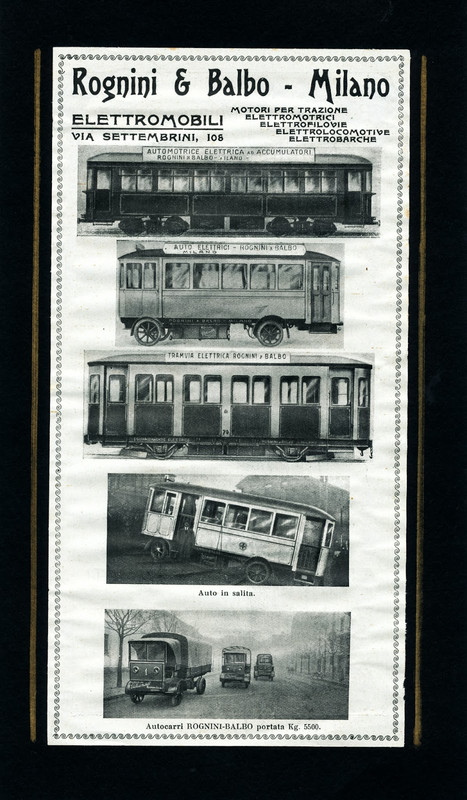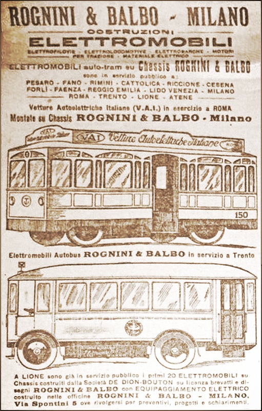 Il 6 gennaio 1922 la Rognini & Balbo, azienda originariamente bergamasca e poi trasferitasi a Milano, già affermata nel mercato della trazione elettrica ad accumulatori, iniziò l’esercizio di una linea a Milano, ma nel capoluogo lombardo l’esperimento, per via dei limiti di esercizio, ebbe scarso successo.