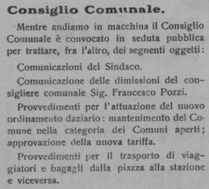 Nelle sedute del Consiglio comunale del 19 e del 25 gennaio 1924 vengono iscritti per la trattazione due oggetti relativi a provvedimenti inerenti il trasporto dei viaggiatori e bagagli dalla piazza alla stazione e viceversa (purtroppo non è possibile consultare i verbali delle due adunanze in quanto andati perduti durante il secondo conflitto mondiale, ma continuerò la ricerca nell’Archivio di Stato).
