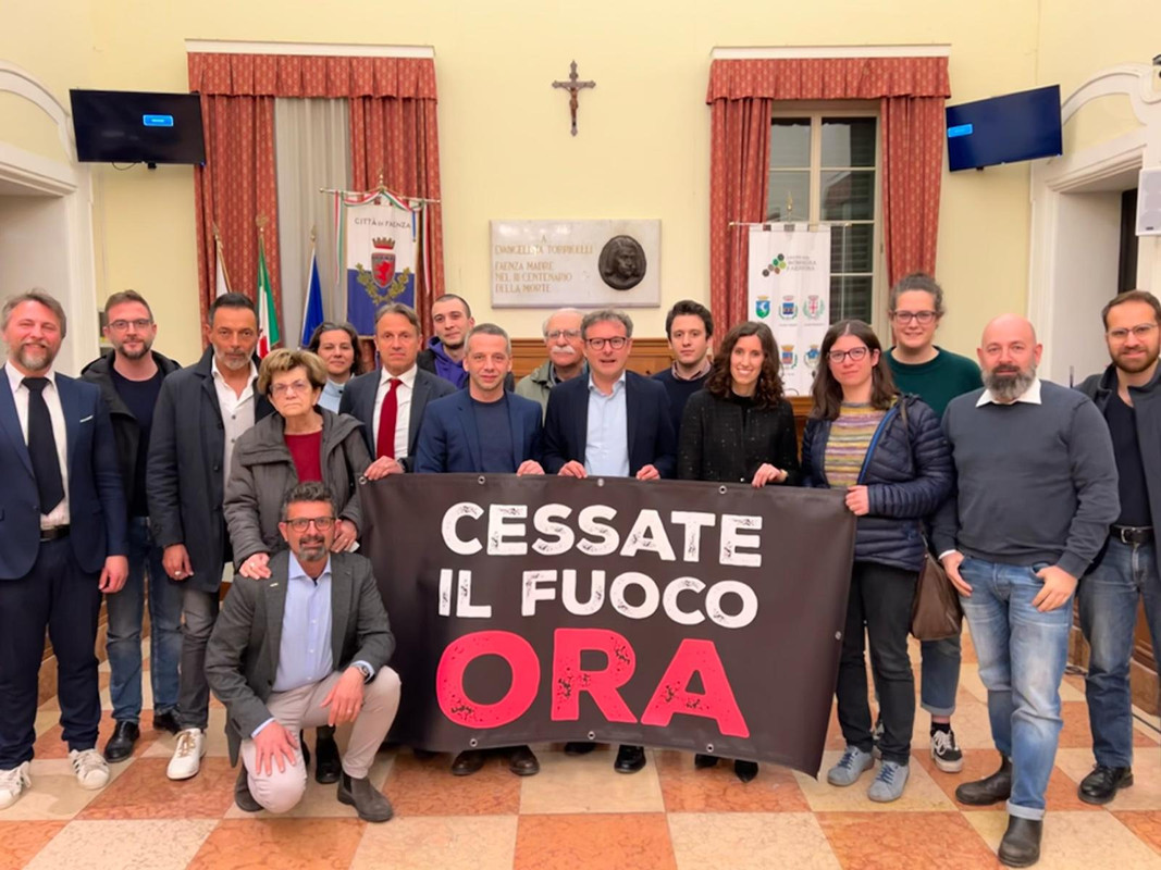che vengano affissi sul loggiato della Residenza Municipale uno striscione con la scritta “CESSATE IL FUOCO ORA”, come da sottostante immagine, e che vengano esposte le bandiere di Israele, della Palestina e quella della Pace.