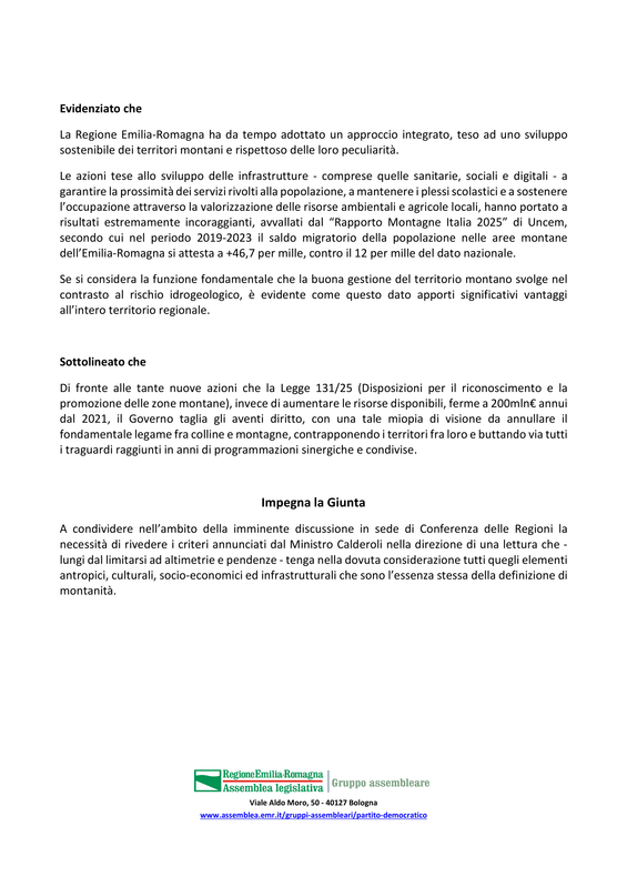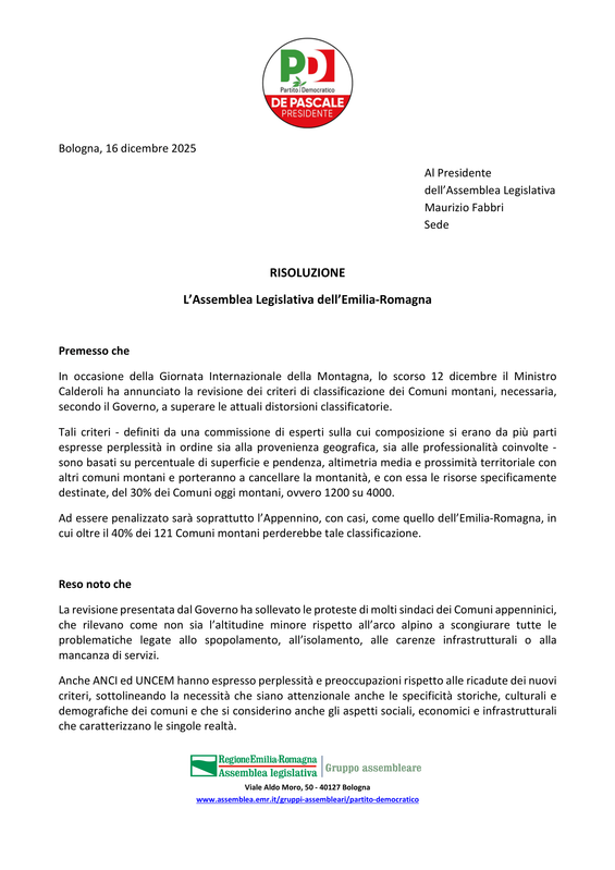 Oggi è stata presentata una risoluzione all’Assemblea Legislativa dal Gruppo Pd per chiedere alla Giunta Regionale di farsi portavoce in Conferenza delle Regioni della necessità di rivedere i criteri annunciati dal Governo al fine di tenere nella dovuta considerazione tutti quegli elementi antropici, culturali, socio-economici ed infrastrutturali che sono l’essenza stessa della definizione di montanità.